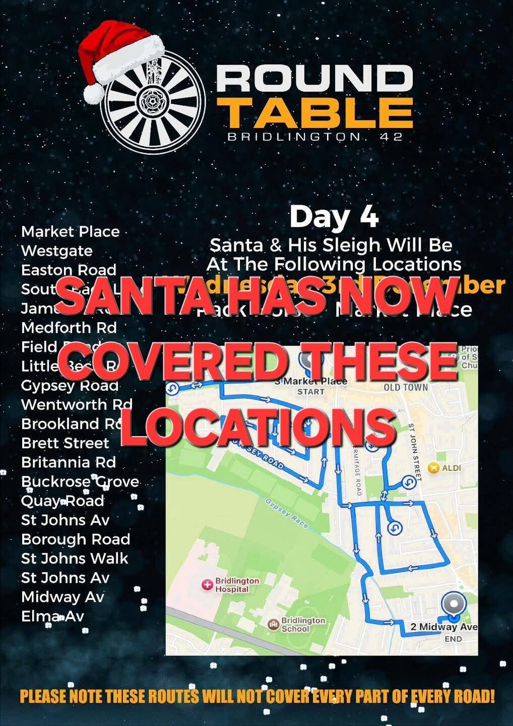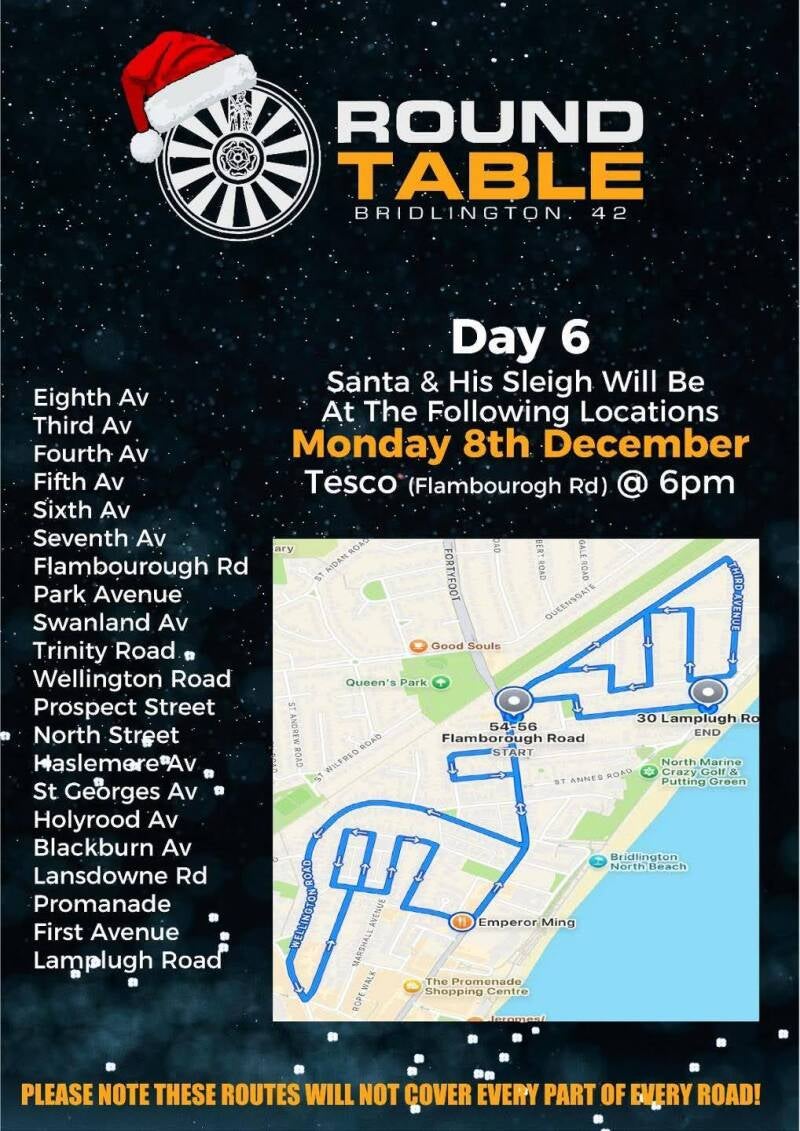 Santa & His Sleigh will be setting off from Tesco - Hilderthorpe at 5.30pm and will be travelling to the following locations:
